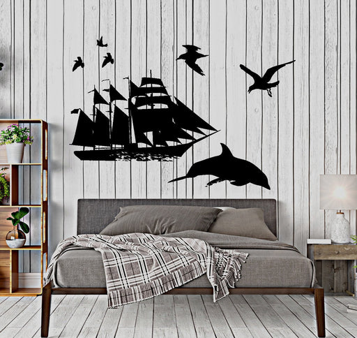 Autocollant mural en vinyle représentant un bateau à moteur, un dauphin, une mer, une mer, une décoration d'intérieur, cadeau unique, z4394