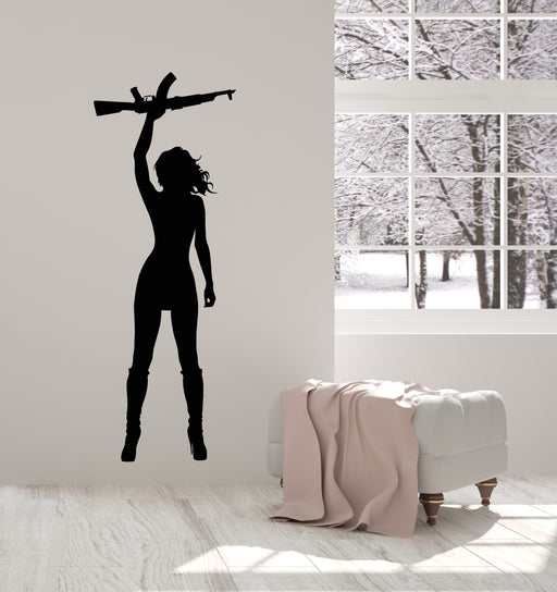 Autocollant mural en vinyle représentant une fille dangereuse avec un pistolet et des armes automatiques (g6126)