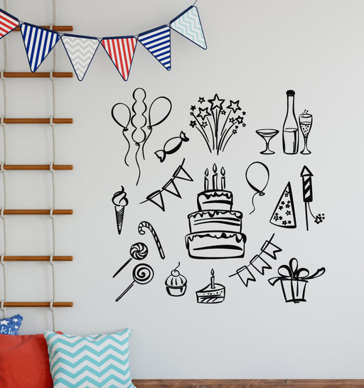 Виниловые наклейки на стену День рождения С праздником Вечеринка Фейерверк Торт Подарок Эскиз Наклейки Фреска (g6858)